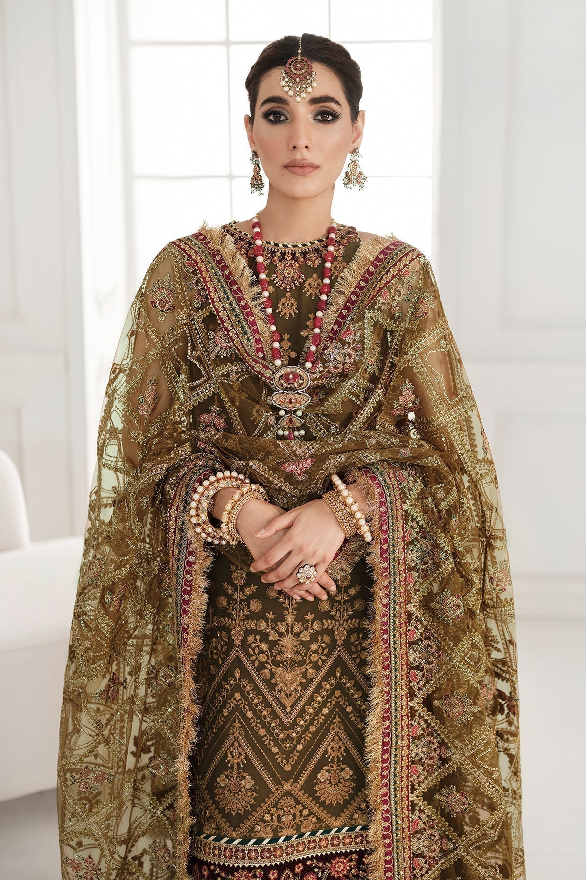 It's time to take your fashion game farthest with a 3-piece olive green chiffon ensemble. The gilded embroidery elaborates the artistic detailing over the shirt. The striking touch of red and maroon intimately complements the outfit's colour. The dupatta accentuates proficiently crafted embroidery. It comes with the silk dyed trouser, draped in elegance. What's your preference? Stitched or unstitched. If it's stitched let us know whether it's a short or long shirt. So, we can tailor it exclusively for you.