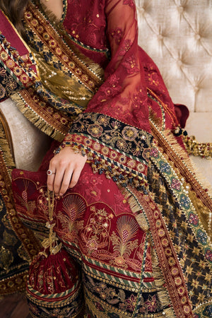 This 3-piece chiffon ensemble shirt is adorned with intricate embroidery on the neckline, sleeves, and borders, blending vibrant hues with delicate floral patterns. Velvet patches further add texture and depth. Accompanied by a heavily embroidered organza dupatta with velvet embellishments., the set is completed with a dyed silk trouser. You can customize it by choosing a classic angrakha style or a basic long shirt to suit your personal preference.