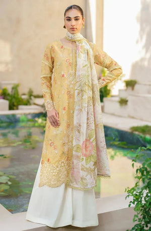 Fabric … Lawn…. Colour.Lemon… Length.50…. Embroidered Shirt Front ….. Embroidered Organza Border 1… Embroidered Oranga Selvees Bunches… Plain Trouser… Printed Chiffon…