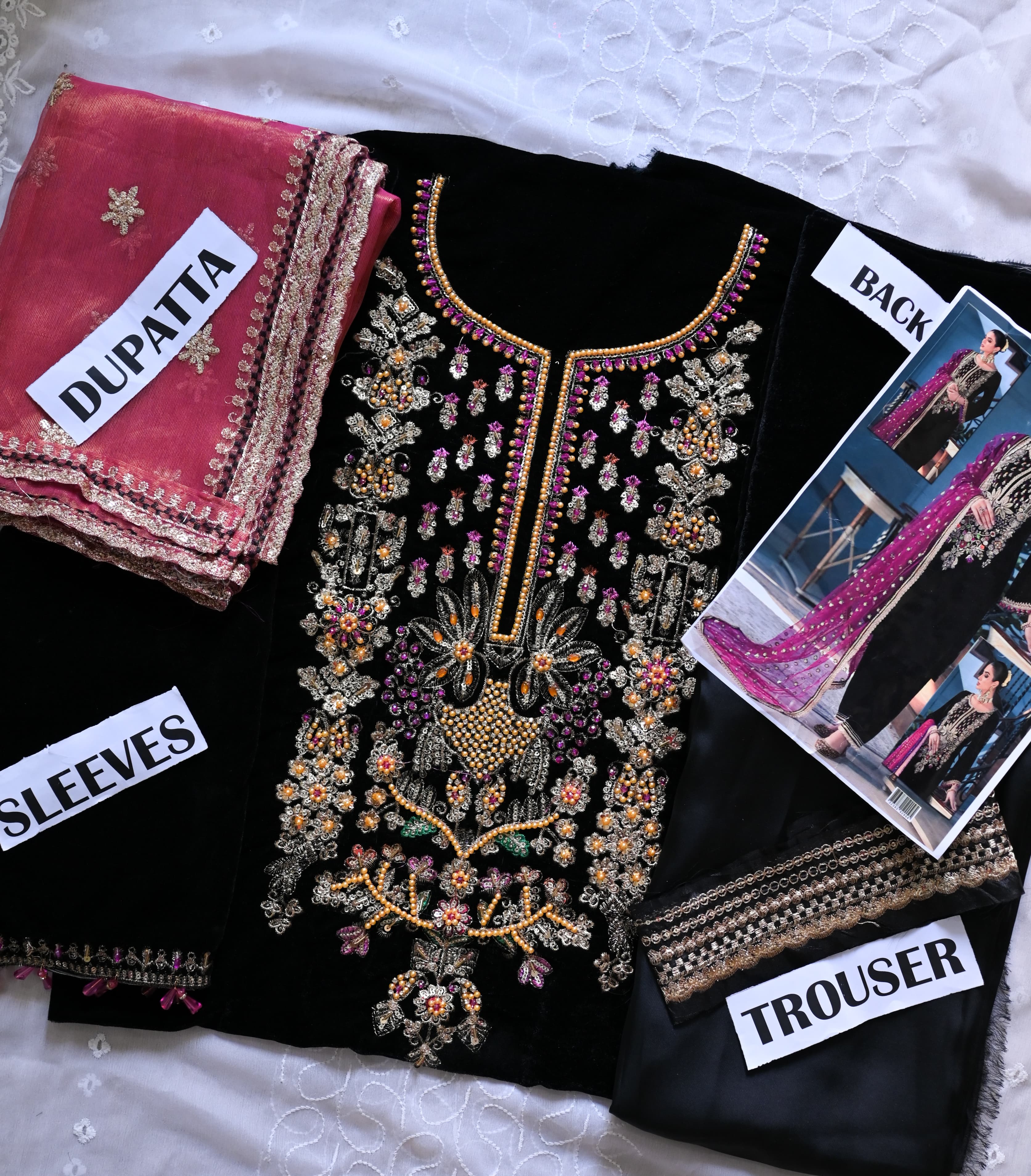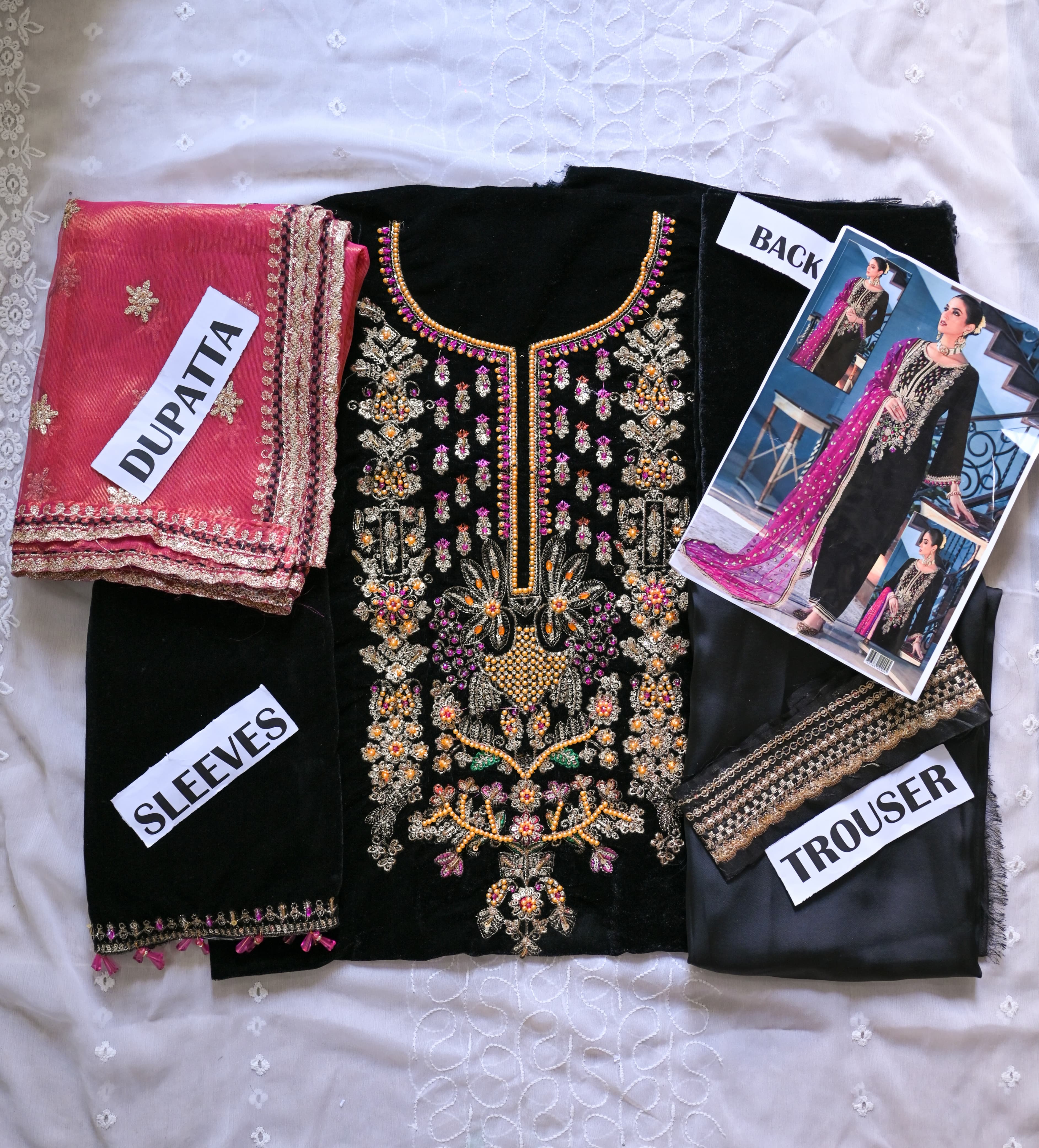 Khudabaksh Black Luxury Velvet Dress Embroidered 3 Piece Unstitched