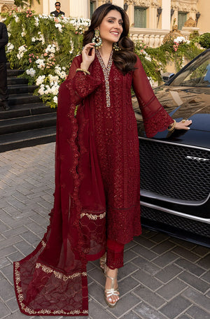 Evoke a princess glamour with this stunning deep maroon chiffon shirt festooned with lovely sequins embroidery on all over the front and hem of the sleeves with floral gold embellished ban collar neckline. It comes with embroidered tonal raw silk pants and intricately embellished chiffon dupatta with delicate gold details and sequin patterns on pallu. This design is a must-have for your festivities.